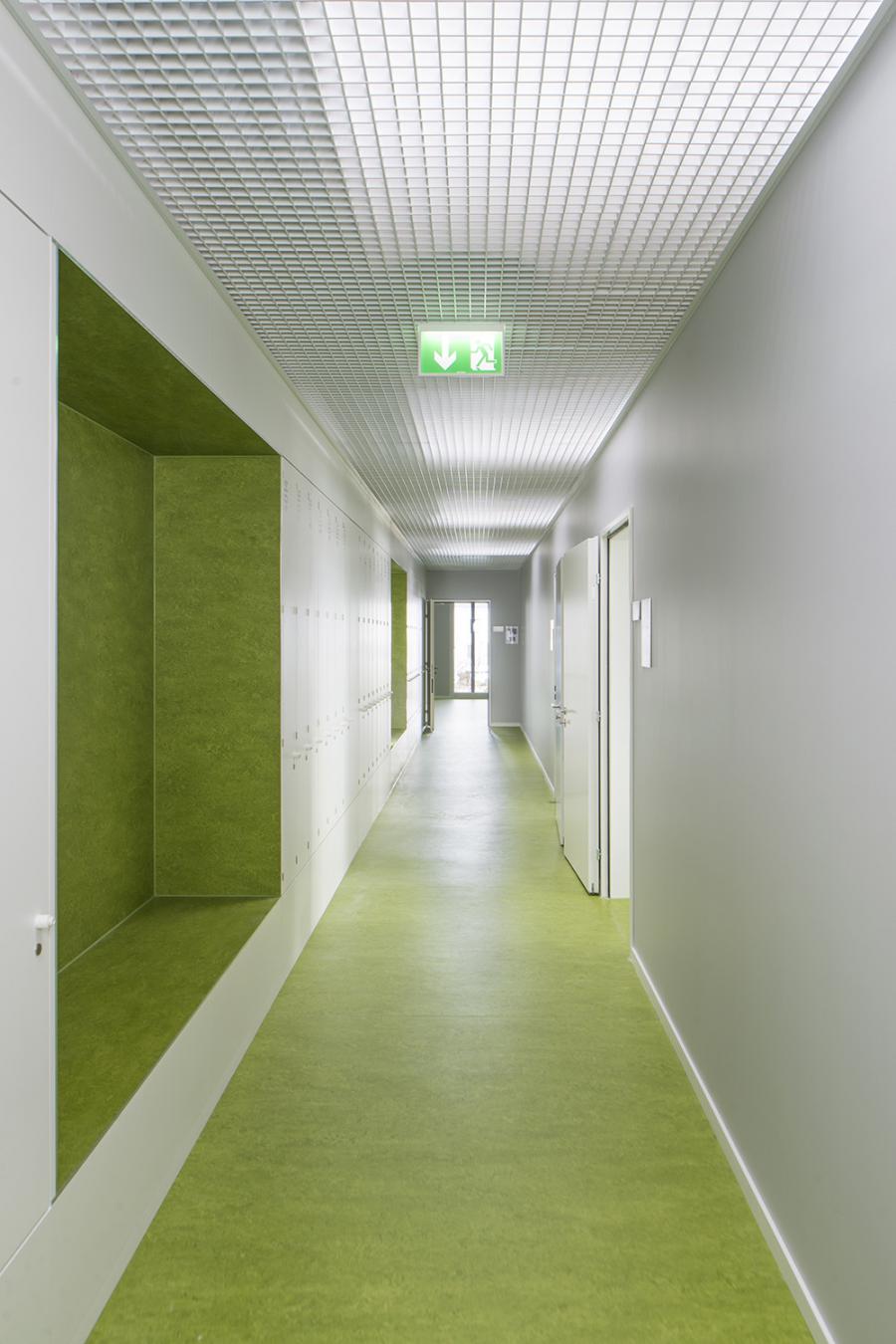 La décision de s’implanter au-dessus du bâtiment existant a été prise dans le but de minimiser l’impact sur le complexe scolaire existant. En effet, si l’extension avait été implantée comme un nouveau volume sur le site, la lecture spatiale en aurait été fortement perturbée. Ce type d’implantation permet également de faire des économies, en matière d’aménagement du terrain, grâce à l’utilisation d’une structure existante ainsi que des installations techniques déjà en place.